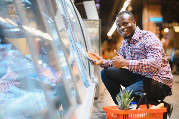 Portrait of smiling man at supermarket. Young african man with shopping basket in grocery store.