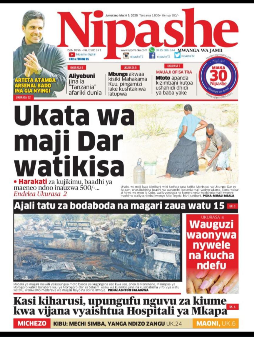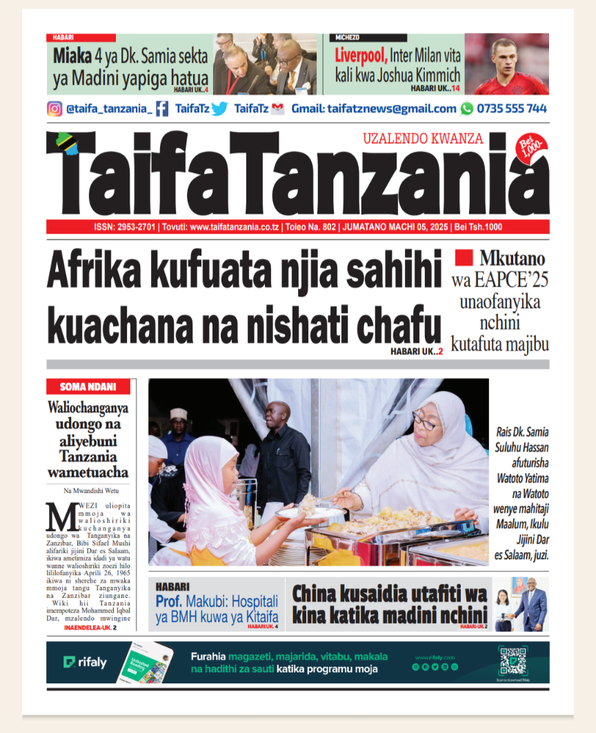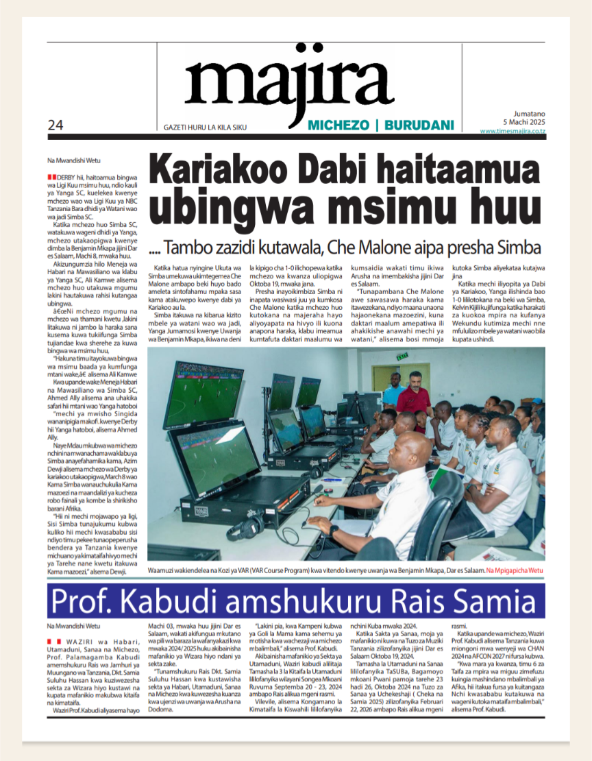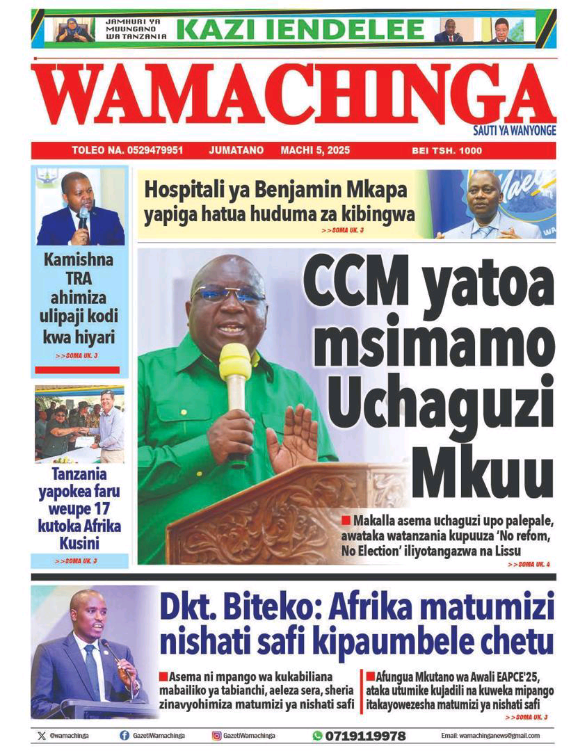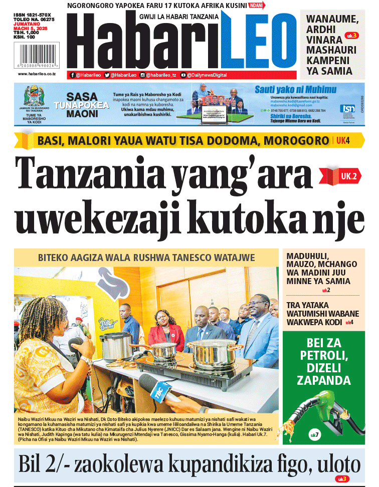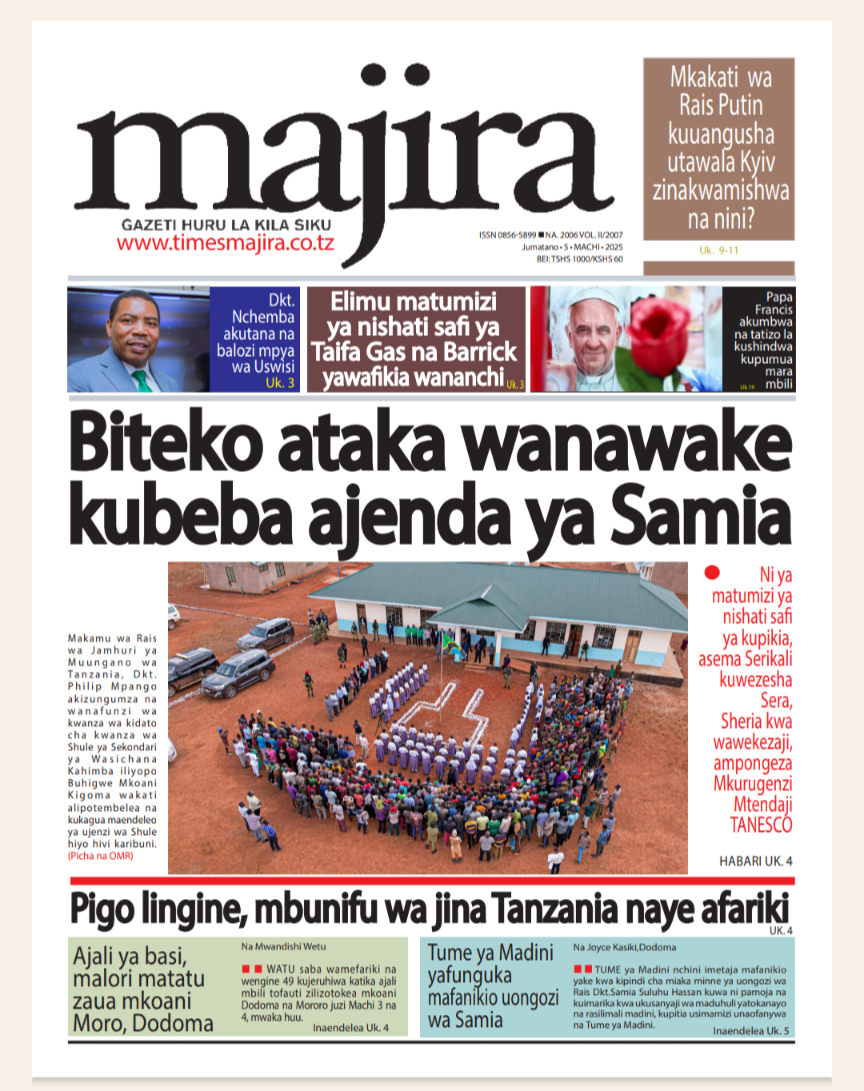 HomeMAGAZETI March 5, 2025 Mariam Mallya FacebookInstagramTwitterYoutube Latest Posts NEWS TEA, UNICEF WAJENGA VITUO VYA MAFUNZO YA UFUNDI (IPOSA) KWA VIJANA Filamu GN ECO SOLUTION YAENDESHA MAFANIKIO PROGRAMU YA UJENZI WA TIMU KWA WAFANYAKAZI WA NBAA HABARI MBUNGE SHAYO AWAPATIA VIJANA 30 WASIO NA UWEZO UFADHILI WA MASOMO VETA HABARI VIJIJI 160 KUNUFAIKA NA MPANGO WA MATUMIZI BORA YA ARDHI KUPUNGUZA MIGOGORO CCM YATOA MSIMAMO UCHAGUZI MKUU -MAGAZETINI LEO JUMATANO MARCHI 05/2025 Share FacebookTwitterWhatsAppTelegramLinkedinEmail March 5, 2025 Mariam Mallya FacebookInstagramTwitterYoutube RELATED ARTICLES MAGAZETI Nilikataliwa na Wanaume Wote Kwa Sababu ya Ulemavu Wangu, Lakini Hatua Niliyopiga Ilinifanya Niolewe na Tajiri Niliyekuwa Namwota MAGAZETI MBINU YA KUJENGA UCHUMI IMARA NA ENDELEVU! MAGAZETI RAIS SAMIA AWAFUNDA VIONGOZI WA AFRIKA _MAGAZETINI LEO JUMAMOSI MACHI 22/2025 MAGAZETI BEI YA PETROLI ,DIZELI YAPANDA-HABARI KUBWA MAGAZETINI LEO JUMAPILI MACHI 09/2025A MAGAZETI RAIS SAMIA KUISUKA UPYA MUHIMBILI- HABARI KUBWA MAGAZETINI LEO IJUMAA MARCH 07/2025 Latest Posts NEWS TEA, UNICEF WAJENGA VITUO VYA MAFUNZO YA UFUNDI (IPOSA) KWA VIJANA Filamu GN ECO SOLUTION YAENDESHA MAFANIKIO PROGRAMU YA UJENZI WA TIMU KWA WAFANYAKAZI WA NBAA HABARI MBUNGE SHAYO AWAPATIA VIJANA 30 WASIO NA UWEZO UFADHILI WA MASOMO VETA HABARI VIJIJI 160 KUNUFAIKA NA MPANGO WA MATUMIZI BORA YA ARDHI KUPUNGUZA MIGOGORO Don't Miss HABARI MSANDO AZITAKA HALMASHAURI KUSHIRIKIANA NA WANANCHI KUIMARISHA MIUNDOMBINU YA SHULE ZA UBUNGO HABARI JOHN HECHE: HATUTAMBUI SIKU 100 ZA RAIS SAMIA, TUNATAKA UCHAGUZI MPYA. HABARI MSIGWA: WATANZANIA NI WAMOJA BAADA YA UCHAGUZI, TUIACHE TUME YA JAJI CHANDE IFANYE KAZI YAKE NEWS MAOMBI YAFANYIKA NGORONGORO KUPUNGUZA MIGOGORO YA ARDHI MAKALA Mwanaume Ajikuta Akikabiliana na Hatari ya Diabetes, Hatua Ndogo Iliyomsaidia Kupona Stay in touchTo be updated with all the latest news, offers and special announcements.Sign up