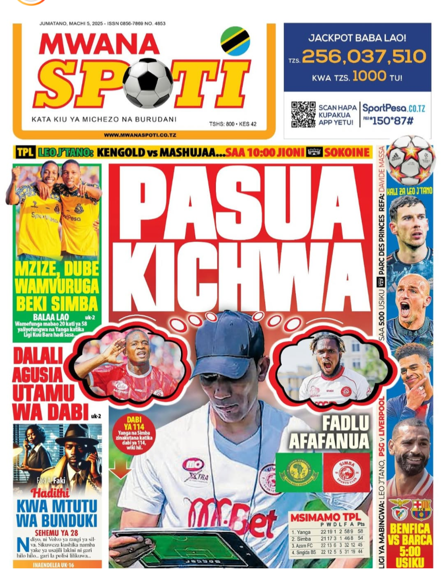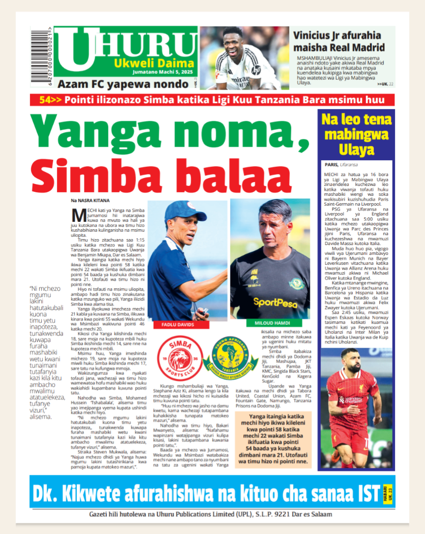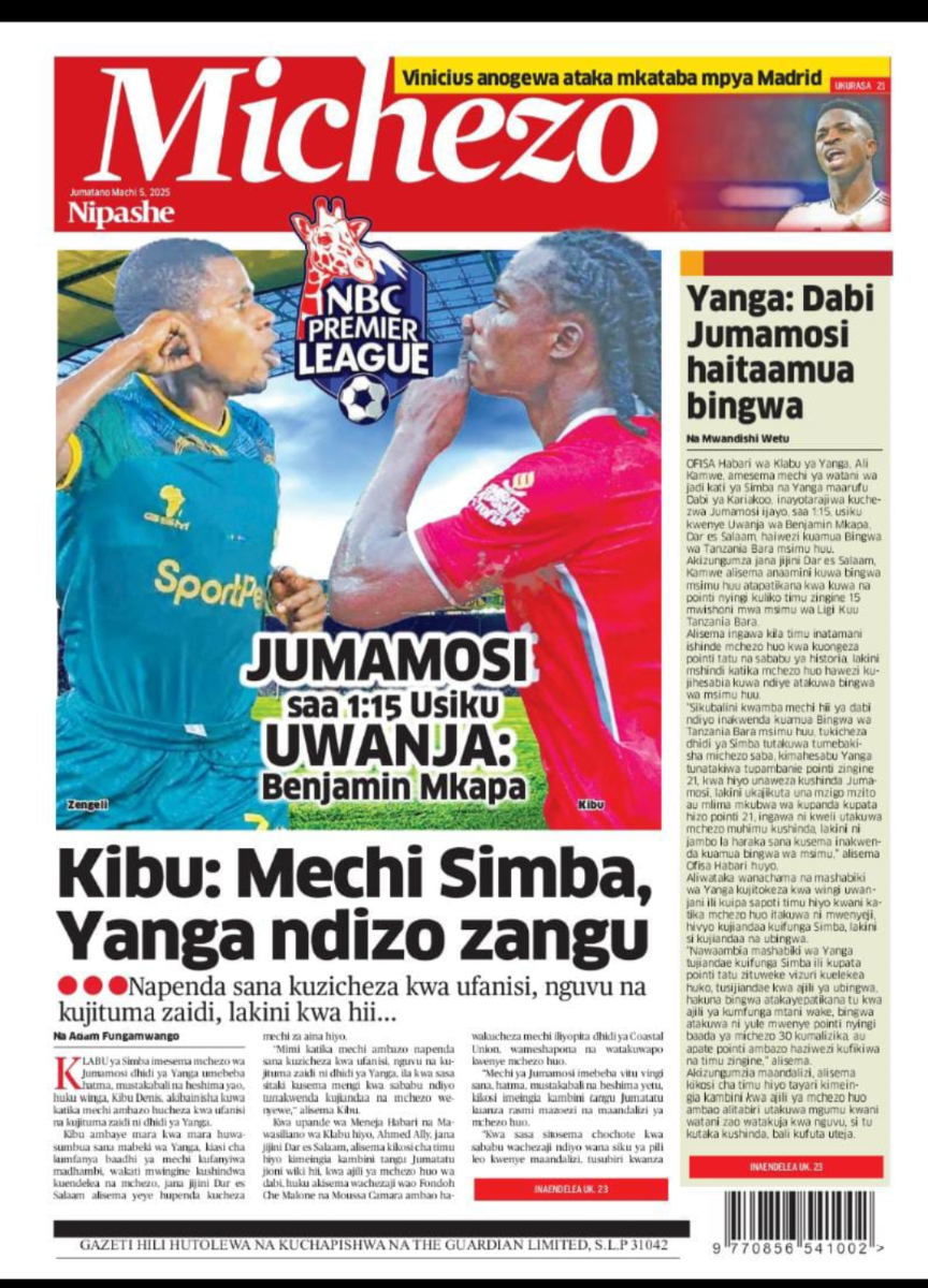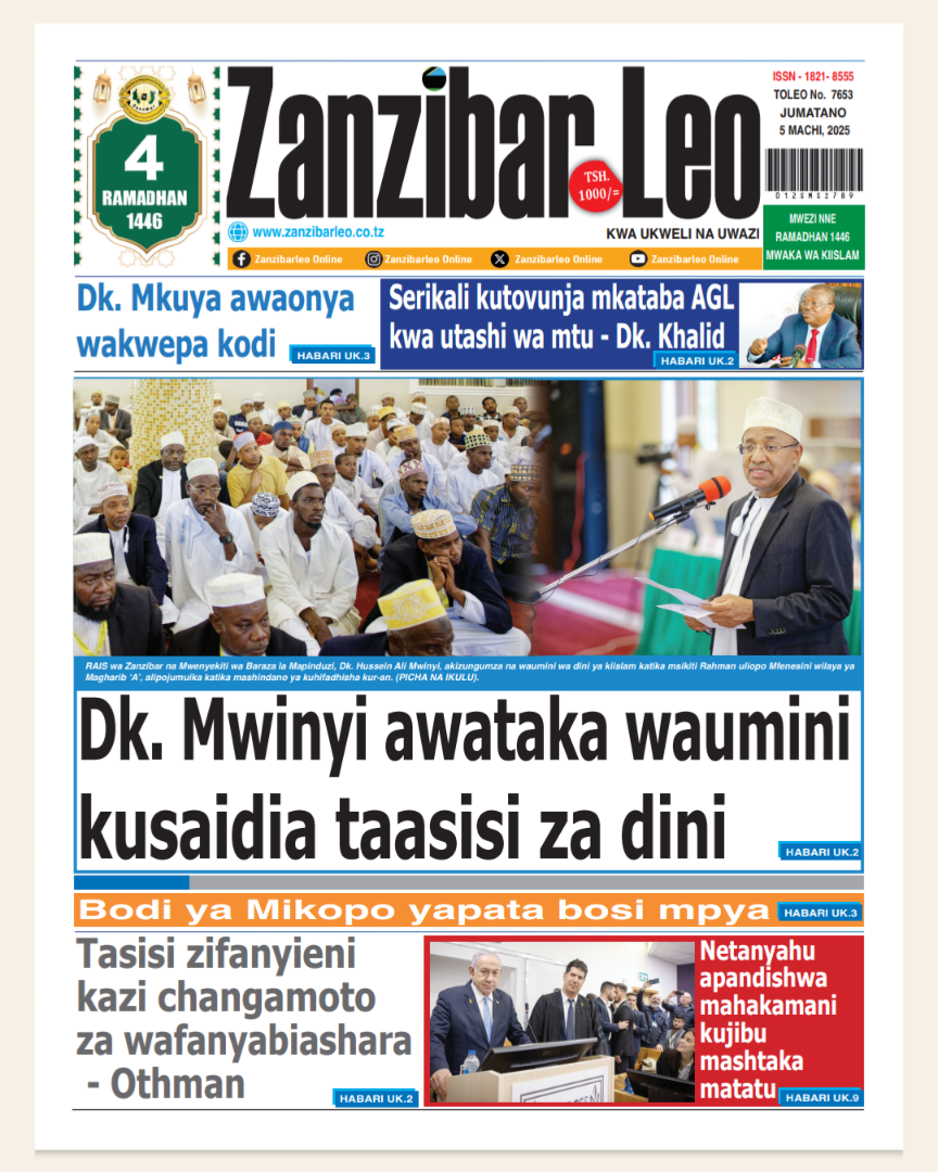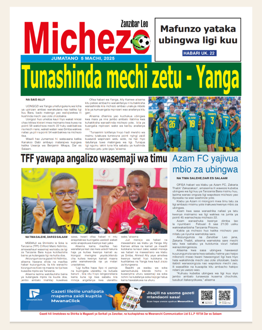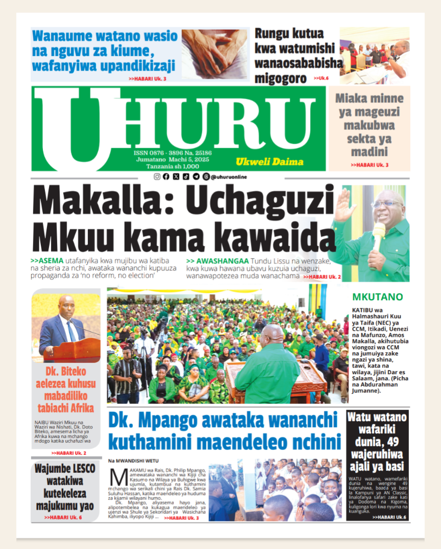 HomeMAGAZETI March 5, 2025 Mariam Mallya FacebookInstagramTwitterYoutube Latest Posts NEWS TEA, UNICEF WAJENGA VITUO VYA MAFUNZO YA UFUNDI (IPOSA) KWA VIJANA Filamu GN ECO SOLUTION YAENDESHA MAFANIKIO PROGRAMU YA UJENZI WA TIMU KWA WAFANYAKAZI WA NBAA HABARI MBUNGE SHAYO AWAPATIA VIJANA 30 WASIO NA UWEZO UFADHILI WA MASOMO VETA HABARI VIJIJI 160 KUNUFAIKA NA MPANGO WA MATUMIZI BORA YA ARDHI KUPUNGUZA MIGOGORO CCM YATOA MSIMAMO UCHAGUZI MKUU -MAGAZETINI LEO JUMATANO MARCHI 05/2025 Share FacebookTwitterWhatsAppTelegramLinkedinEmail March 5, 2025 Mariam Mallya FacebookInstagramTwitterYoutube RELATED ARTICLES MAGAZETI Nilikataliwa na Wanaume Wote Kwa Sababu ya Ulemavu Wangu, Lakini Hatua Niliyopiga Ilinifanya Niolewe na Tajiri Niliyekuwa Namwota MAGAZETI MBINU YA KUJENGA UCHUMI IMARA NA ENDELEVU! MAGAZETI RAIS SAMIA AWAFUNDA VIONGOZI WA AFRIKA _MAGAZETINI LEO JUMAMOSI MACHI 22/2025 MAGAZETI BEI YA PETROLI ,DIZELI YAPANDA-HABARI KUBWA MAGAZETINI LEO JUMAPILI MACHI 09/2025A MAGAZETI RAIS SAMIA KUISUKA UPYA MUHIMBILI- HABARI KUBWA MAGAZETINI LEO IJUMAA MARCH 07/2025 Latest Posts NEWS TEA, UNICEF WAJENGA VITUO VYA MAFUNZO YA UFUNDI (IPOSA) KWA VIJANA Filamu GN ECO SOLUTION YAENDESHA MAFANIKIO PROGRAMU YA UJENZI WA TIMU KWA WAFANYAKAZI WA NBAA HABARI MBUNGE SHAYO AWAPATIA VIJANA 30 WASIO NA UWEZO UFADHILI WA MASOMO VETA HABARI VIJIJI 160 KUNUFAIKA NA MPANGO WA MATUMIZI BORA YA ARDHI KUPUNGUZA MIGOGORO Don't Miss HABARI MSANDO AZITAKA HALMASHAURI KUSHIRIKIANA NA WANANCHI KUIMARISHA MIUNDOMBINU YA SHULE ZA UBUNGO HABARI JOHN HECHE: HATUTAMBUI SIKU 100 ZA RAIS SAMIA, TUNATAKA UCHAGUZI MPYA. HABARI MSIGWA: WATANZANIA NI WAMOJA BAADA YA UCHAGUZI, TUIACHE TUME YA JAJI CHANDE IFANYE KAZI YAKE NEWS MAOMBI YAFANYIKA NGORONGORO KUPUNGUZA MIGOGORO YA ARDHI MAKALA Mwanaume Ajikuta Akikabiliana na Hatari ya Diabetes, Hatua Ndogo Iliyomsaidia Kupona Stay in touchTo be updated with all the latest news, offers and special announcements.Sign up