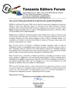Jukwaa la Wahariri Tanzania (TEF), limetoa tamko rasmi likilaani vikali taarifa za kutekwa kwa aliyekuwa Balozi wa Tanzania nchini Cuba, Humphrey Polepole, na kulitaka Jeshi la Polisi kuchunguza kwa haraka tukio hilo na kueleza ukweli kwa umma.