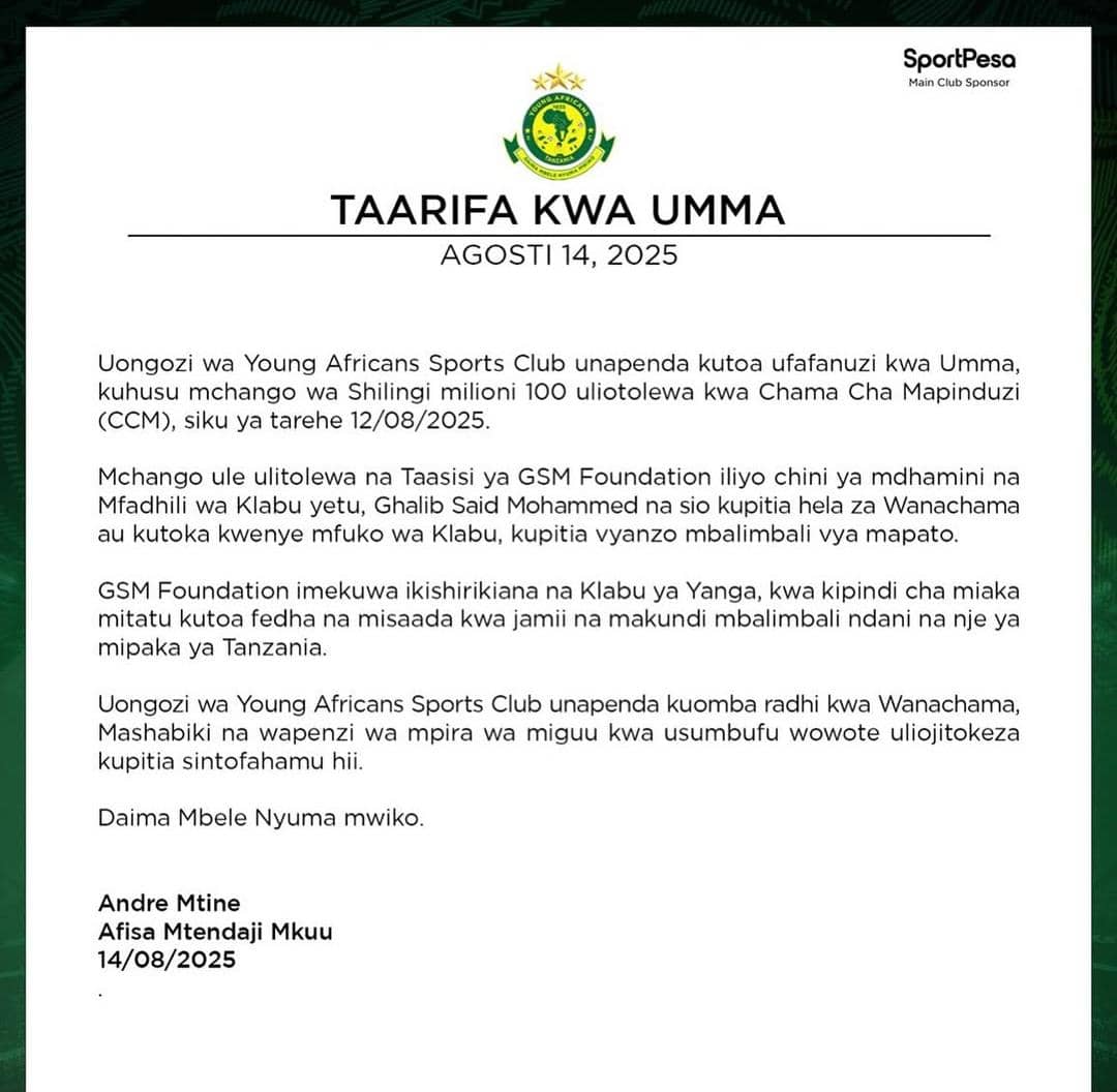 “Mchango ule ulitolewa na taasisi ya GSM Foundation iliyo chini ya mdhamini na mfadhili wa klabu yetu Ghalib Said Mohammed na sio kupitia hela za wanachama au kutoka kwenye mfuko wa klabu, kupitia vyanzo mbalimbali vya mapato”, imeeleza sehemu ya taarifa ya ‘ufafanuzi’ ya Yanga SC iliyosainiwa na Mtendaji Mkuu wake Andrea Mtine